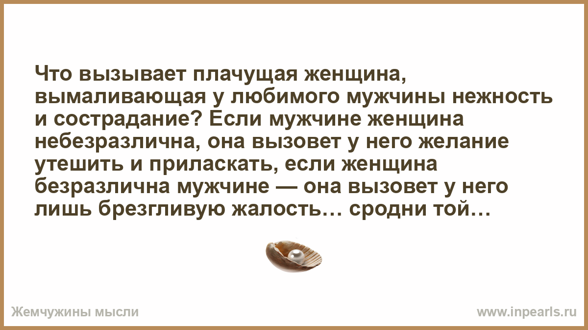 Что вызывает плачущая женщина, вымаливающая у любимого мужчины нежность и сострадание? Если мужчине женщина небезразлична, она вызовет у него желание утешить и приласкать, если женщина безразлична мужчине — она вызовет у него лишь брезгливую жалость… сродни той, которую вызывает нищенка у благополучных прохожих…