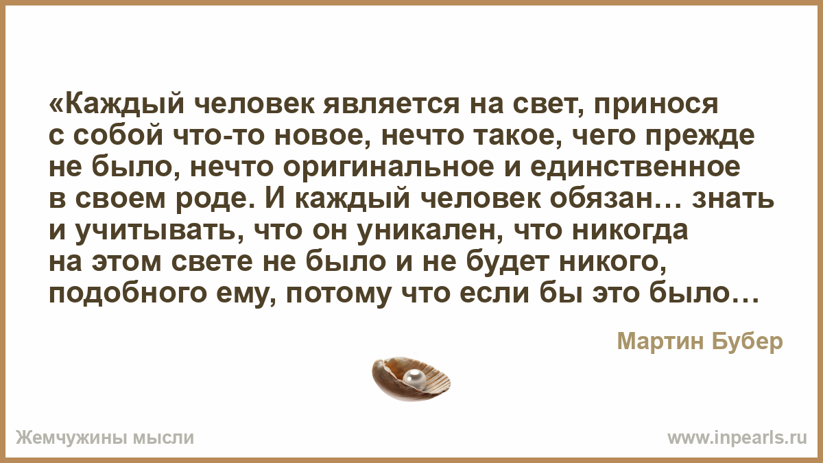 «Каждый человек является на свет, принося с собой что-то новое, нечто такое, чего прежде не было, нечто оригинальное и единственное в своем роде. И каждый человек обязан… знать и учитывать, что он уникален, что никогда на этом свете не было и не будет никого, подобного ему, потому что если бы это было не так, не было бы нужды и в его появлении. Каждый отдельный человек — нечто новое в этом мире и призван осуществлять в нем свою индивидуальность… Первоочередной долг человека — проявление своих уникальных, беспрецедентных и неповторимых возможностей, но никак не повторение достигнутого, пусть даже это величайшее из достижений»