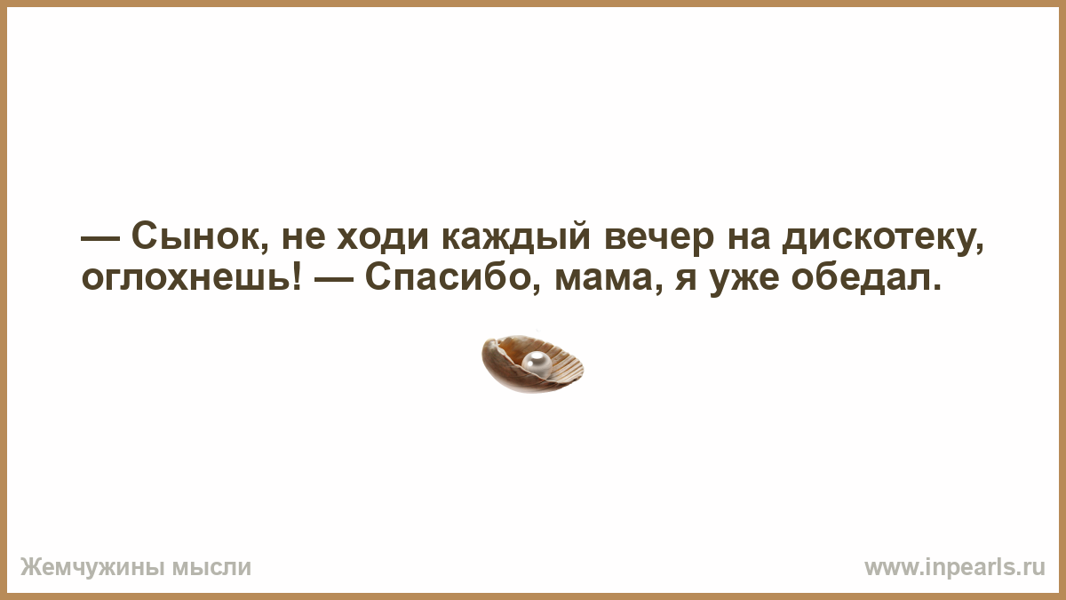 — Сынок, не ходи каждый вечер на дискотеку, оглохнешь! — Спасибо, мама, я уже обедал.