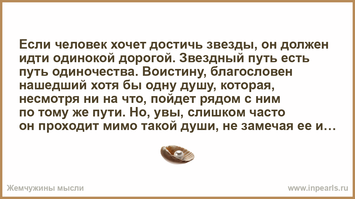 Если человек хочет достичь звезды, он должен идти одинокой дорогой. Звездный путь есть путь одиночества. Воистину, благословен нашедший хотя бы одну душу, которая, несмотря ни на что, пойдет рядом с ним по тому же пути. Но, увы, слишком часто он проходит мимо такой души, не замечая ее и, может статься, с холодным презрением. Вожделение или невежество останавливает его на самом пороге достижения, в то время как он, внимая искусителю, старается взобраться на ступень выше того, чем он по существу является. Но он не сможет сделать этого и потому должен ждать, пока не будет выковано другое звено между звеньями той цепи, что соединила бы его с его другим «я». Или, найдя это другое «я» и отправившись дальше по пути, он встречает пробудившегося ото сна демона в виде земной власти или гордыни, и вот уже звериная мощь, мощь Маммоны одолевает его и вновь сбрасывает с пути.