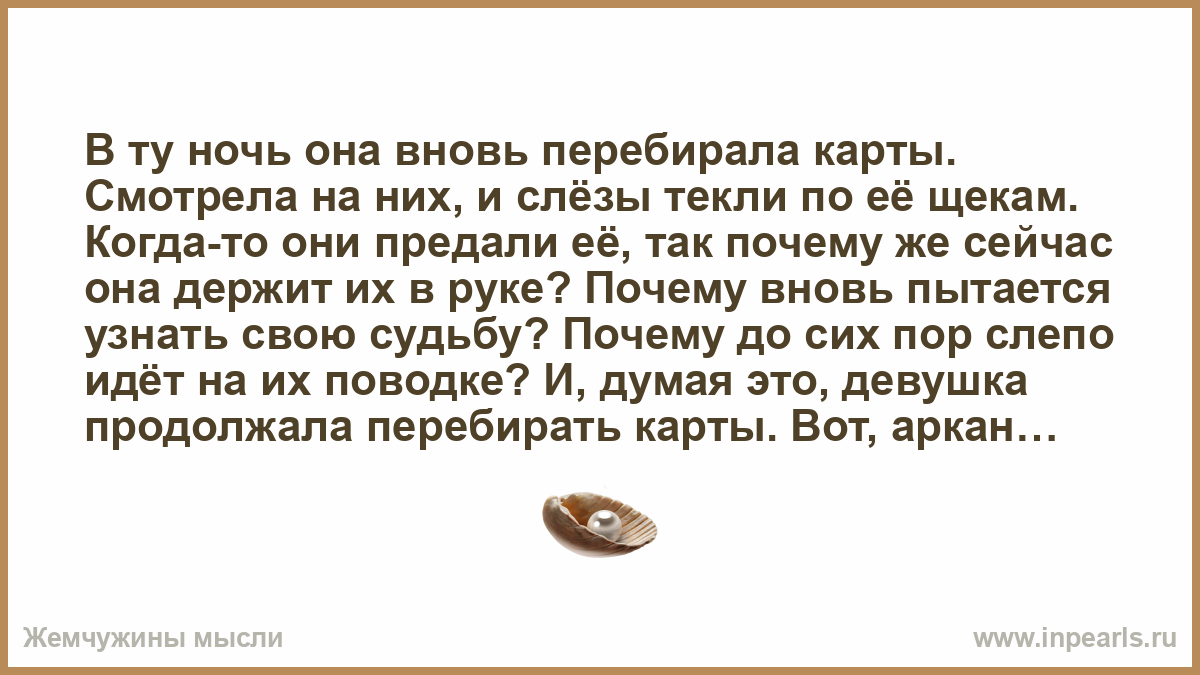 В ту ночь она вновь перебирала карты. Смотрела на них, и слёзы текли по её щекам. Когда-то они предали её, так почему же сейчас она держит их в руке? Почему вновь пытается узнать свою судьбу? Почему до сих пор слепо идёт на их поводке? И, думая это, девушка продолжала перебирать карты. Вот, аркан «Возлюбленные». Стоит ли?
