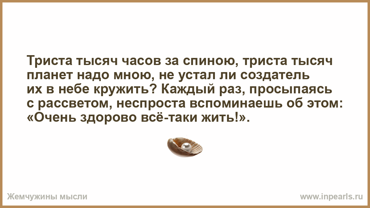 Триста тысяч часов за спиною, триста тысяч планет надо мною, не устал ли создатель их в небе кружить? Каждый раз, просыпаясь с рассветом, неспроста вспоминаешь об этом: «Очень здорово всё-таки жить!».