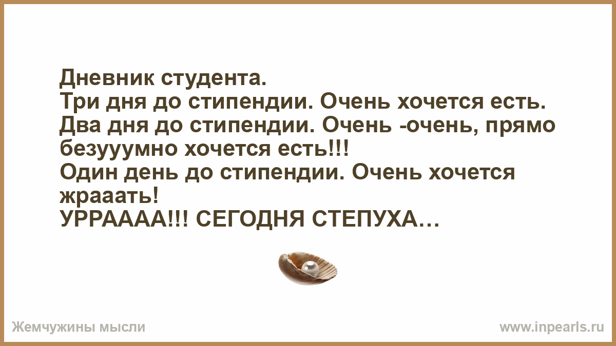 Дневник студента. Три дня до стипендии. Очень хочется есть. Два дня до стипендии. Очень -очень, прямо безууумно хочется есть!!! Один день до стипендии. Очень хочется жрааать! УРРАААА!!! СЕГОДНЯ СТЕПУХА!!! Первый день после стипендии. Ничего не помню… Второй день после стипендии. Ничего не помню… 28 дней до стипендии. ОЧЕНЬ ХОЧЕТСЯ ЕСТЬ!