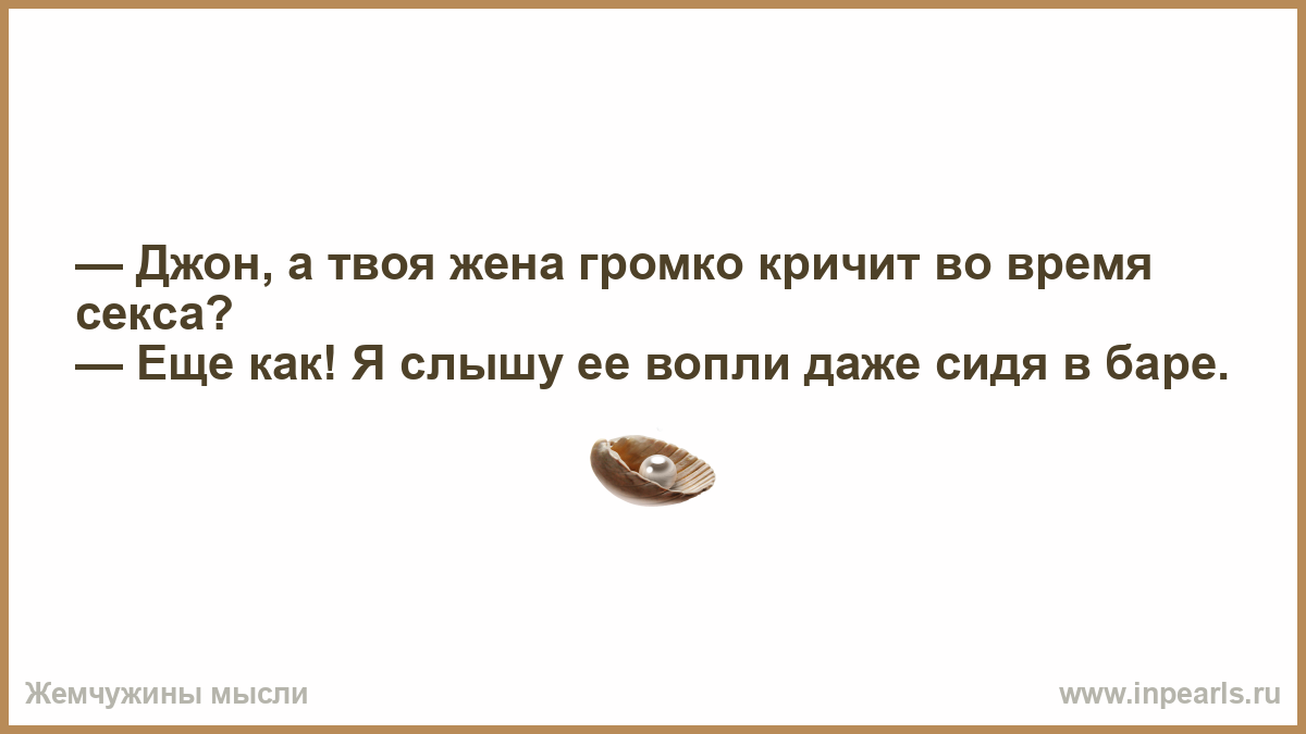 — Джон, а твоя жена громко кричит во время секса? — Еще как! Я слышу ее вопли даже сидя в баре.