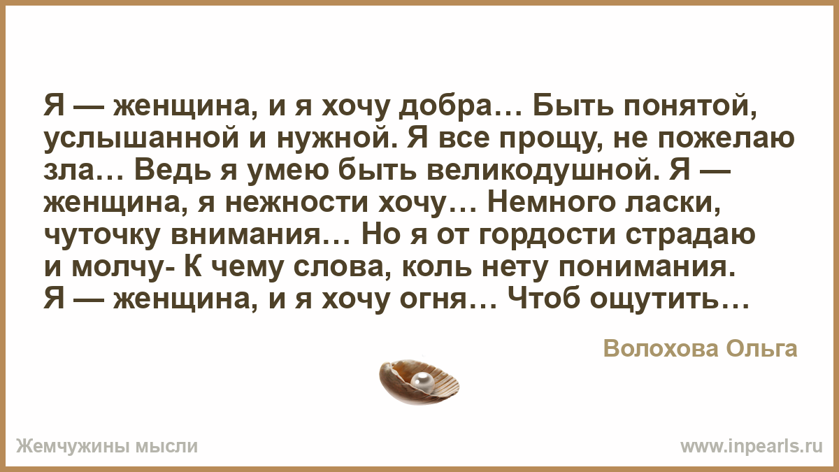 Я — женщина, и я хочу добра… Быть понятой, услышанной и нужной. Я все прощу, не пожелаю зла… Ведь я умею быть великодушной. Я — женщина, я нежности хочу… Немного ласки, чуточку внимания… Но я от гордости страдаю и молчу- К чему слова, коль нету понимания. Я — женщина, и я хочу огня… Чтоб ощутить вновь в страсти упоение. Чтоб крылья выросли и унесли меня в тот мир, где правит балом вдохновение. Я — женщина, и я еще жива лишь потому, что ум над сердцем правит. Подумаю, перетерплю, пойму, а время все по-своему расставит…