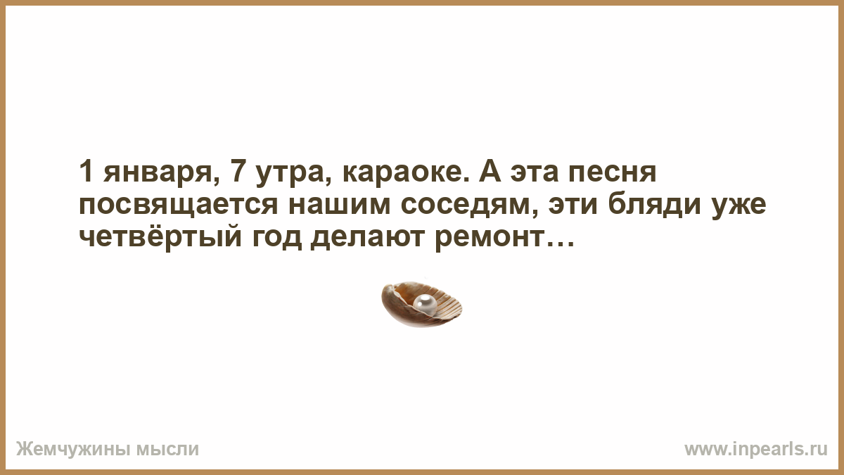 1 января, 7 утра, караоке. А эта песня посвящается нашим соседям, эти бляди уже четвёртый год делают ремонт…