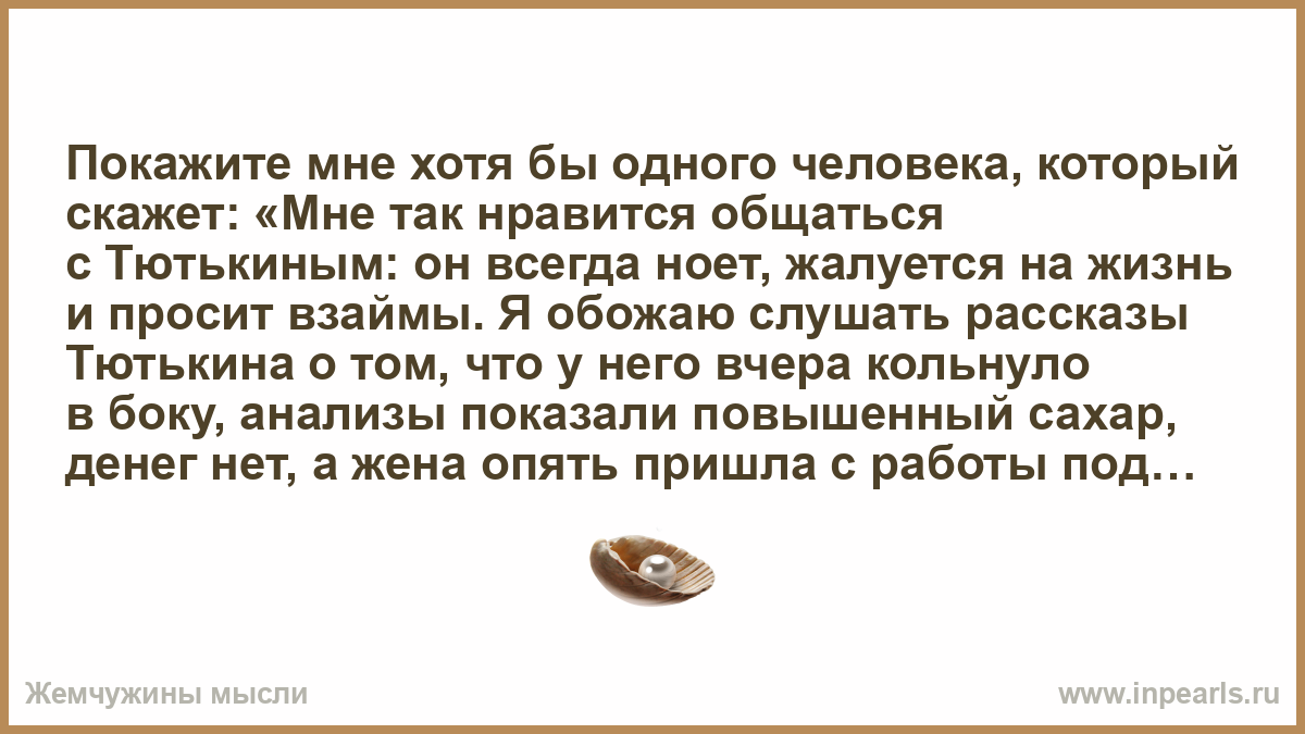 Покажите мне хотя бы одного человека, который скажет: «Мне так нравится общаться с Тютькиным: он всегда ноет, жалуется на жизнь и просит взаймы. Я обожаю слушать рассказы Тютькина о том, что у него вчера кольнуло в боку, анализы показали повышенный сахар, денег нет, а жена опять пришла с работы под утро, мотивируя это большой загруженностью и невыносимым руководством. Не могу дождаться встречи с Тютькиным, чтобы он снова поплакал у меня на плече».