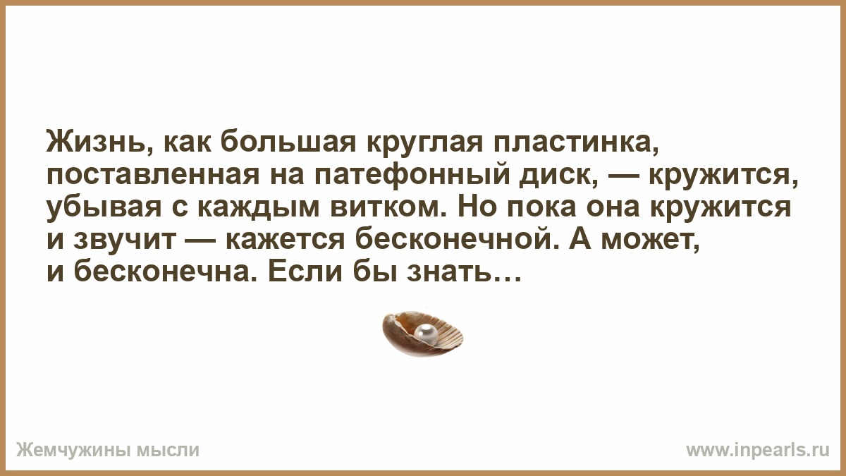 Жизнь, как большая круглая пластинка, поставленная на патефонный диск, — кружится, убывая с каждым витком. Но пока она кружится и звучит — кажется бесконечной. А может, и бесконечна. Если бы знать…