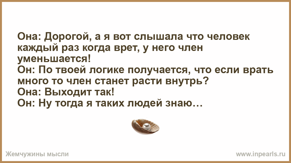 Она: Дорогой, а я вот слышала что человек каждый раз когда врет, у него член уменьшается!