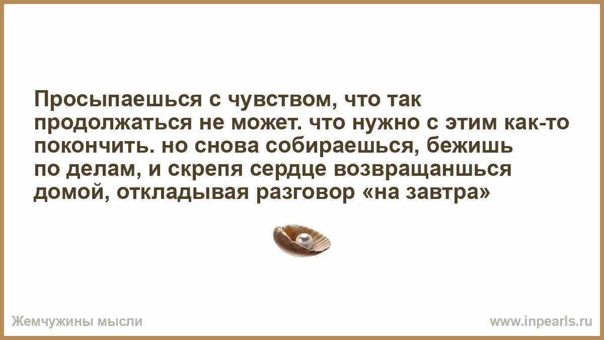 Просыпаешься с чувством, что так продолжаться не может. что нужно с этим как-то покончить. но снова собираешься, бежишь по делам, и скрепя сердце возвращаншься домой, откладывая разговор «на завтра»