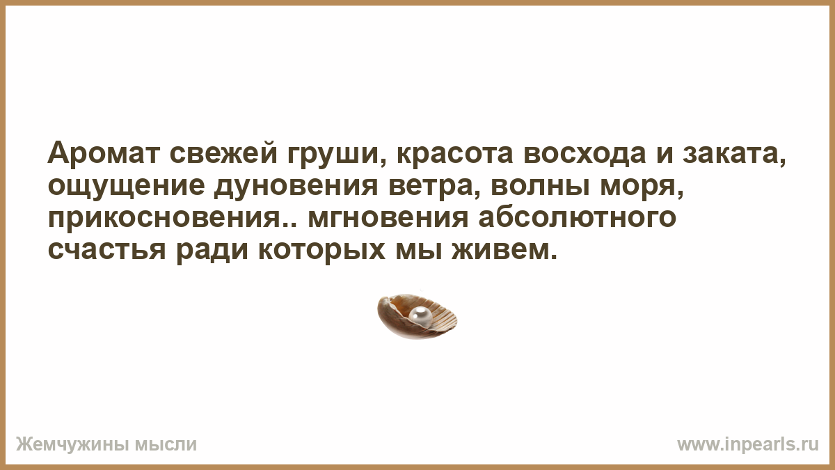 Аромат свежей груши, красота восхода и заката, ощущение дуновения ветра, волны моря, прикосновения.. мгновения абсолютного счастья ради которых мы живем.