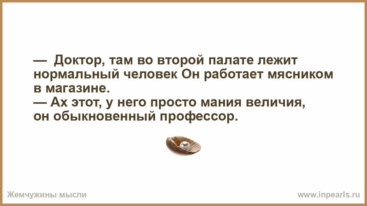 — Доктор, там во второй палате лежит нормальный человек Он работает мясником в магазине. — Ах этот, у него просто мания величия, он обыкновенный профессор.