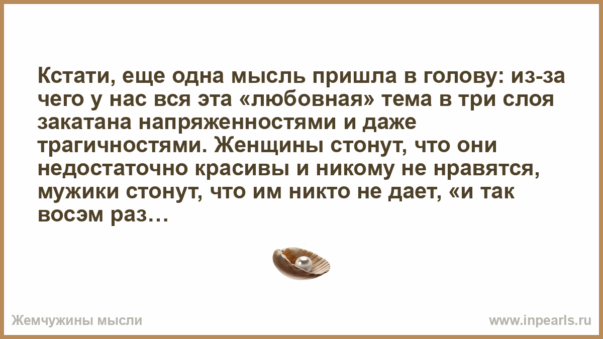 Кстати, еще одна мысль пришла в голову: из-за чего у нас вся эта «любовная» тема в три слоя закатана напряженностями и даже трагичностями. Женщины стонут, что они недостаточно красивы и никому не нравятся, мужики стонут, что им никто не дает, «и так восэм раз».