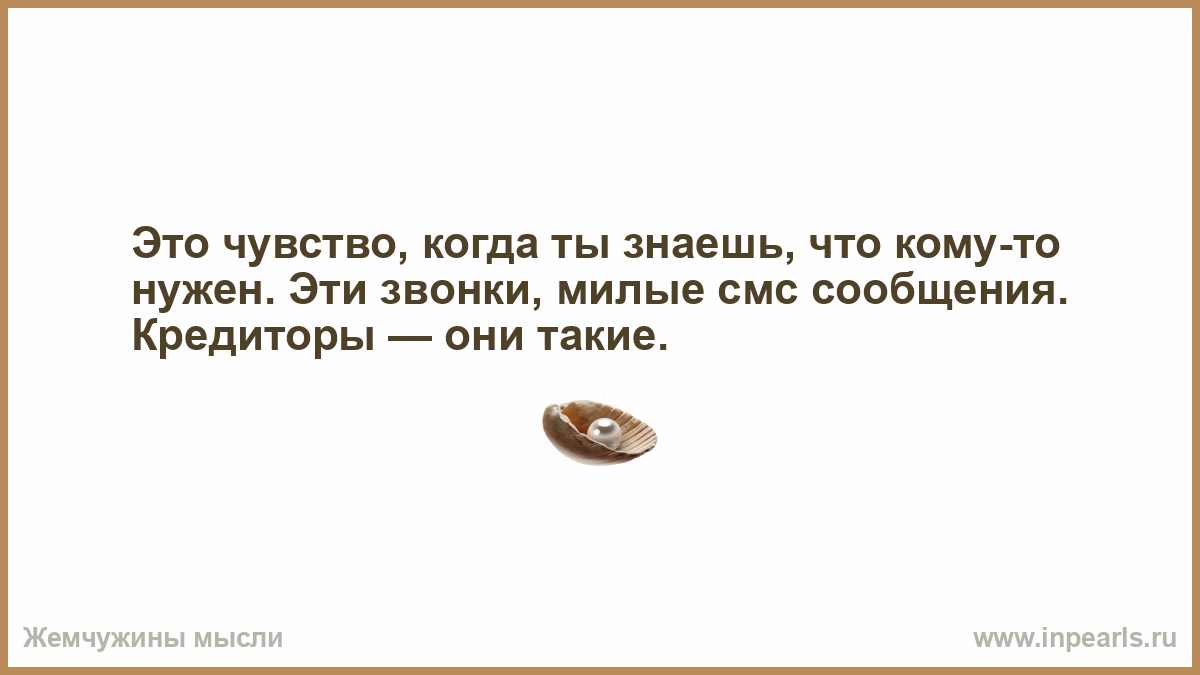 Это чувство, когда ты знаешь, что кому-то нужен. Эти звонки, милые смс сообщения. Кредиторы — они такие.