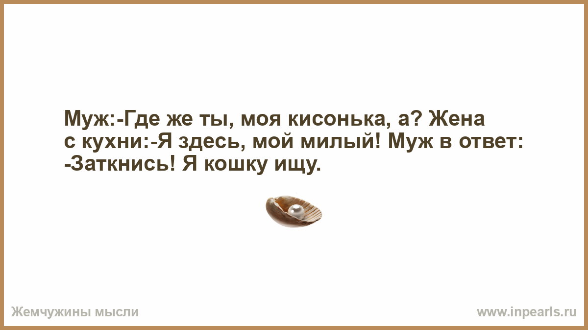 Муж:-Где же ты, моя кисонька, а? Жена с кухни:-Я здесь, мой милый! Муж в ответ: -Заткнись! Я кошку ищу.