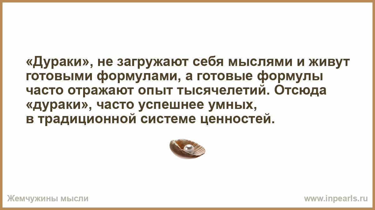 «Дураки», не загружают себя мыслями и живут готовыми формулами, а готовые формулы часто отражают опыт тысячелетий. Отсюда «дураки», часто успешнее умных, в традиционной системе ценностей.