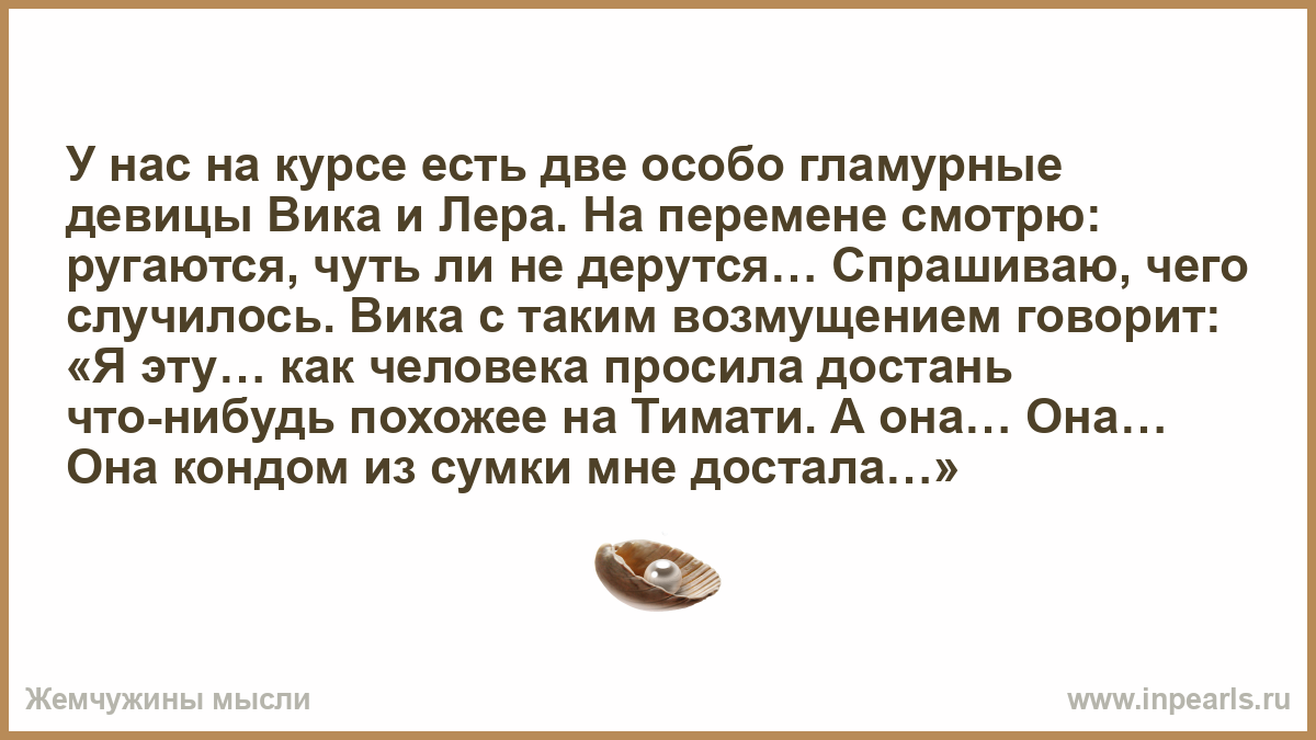 У нас на курсе есть две особо гламурные девицы Вика и Лера. На перемене смотрю: ругаются, чуть ли не дерутся… Спрашиваю, чего случилось. Вика с таким возмущением говорит: «Я эту… как человека просила достань что-нибудь похожее на Тимати. А она… Она… Она кондом из сумки мне достала…»