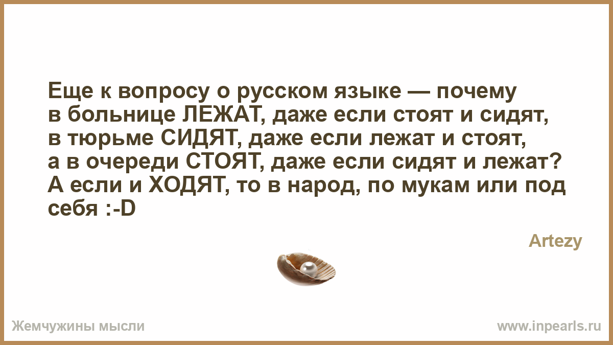 Еще к вопросу о русском языке — почему в больнице ЛЕЖАТ, даже если стоят и сидят, в тюрьме СИДЯТ, даже если лежат и стоят, а в очереди СТОЯТ, даже если сидят и лежат? А если и ХОДЯТ, то в народ, по мукам или под себя :-D