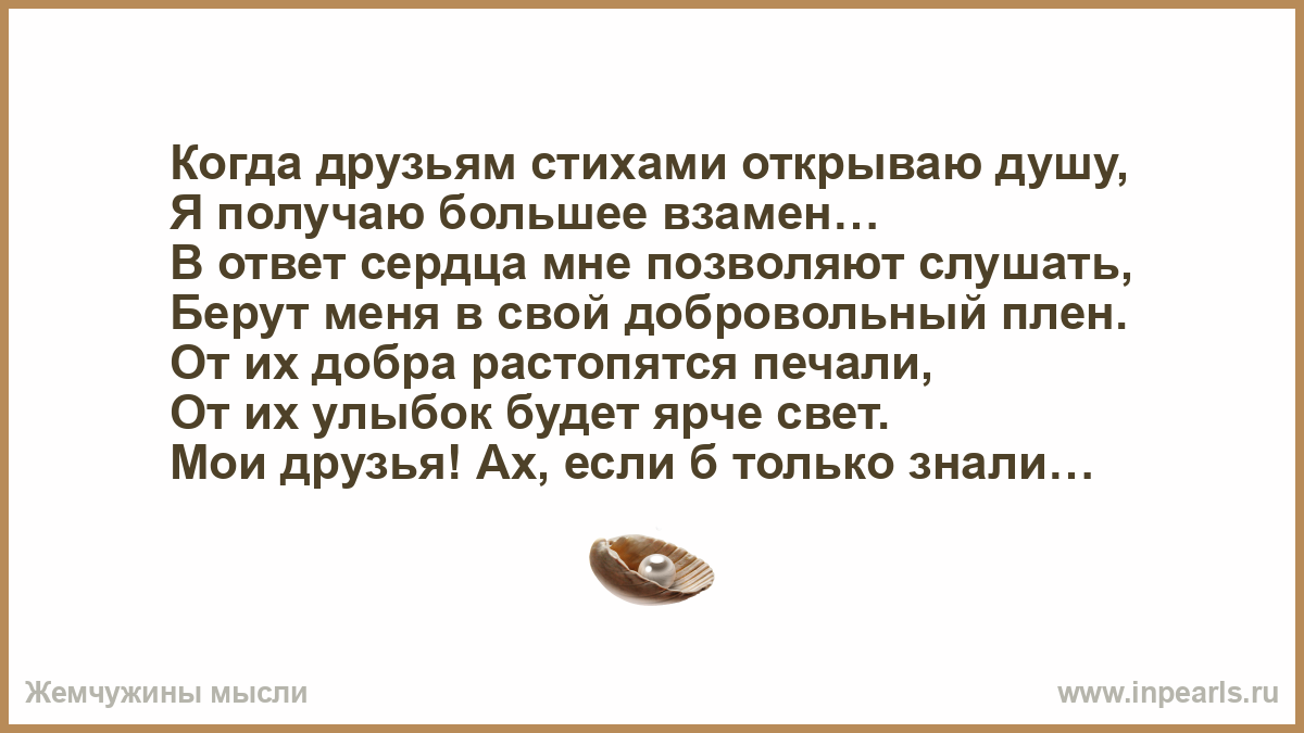 ВРЕМЯ… оно помогает. ЧАСЫ… они быстро идут. МЕЧТЫ… они умирают. ДРУЗЬЯ… всегда меня ждут. СЛЁЗЫ… они высыхают. ЗВЁЗДЫ… для каждого светят. ЧУВСТВА… они раздирают. ОН… он это заметит. ВЕТЕР… он быстро разгонит. «НЕТ»… оно значит «ДА». ДА… потому что он вспомнит. а СТИХИ… они навсегда