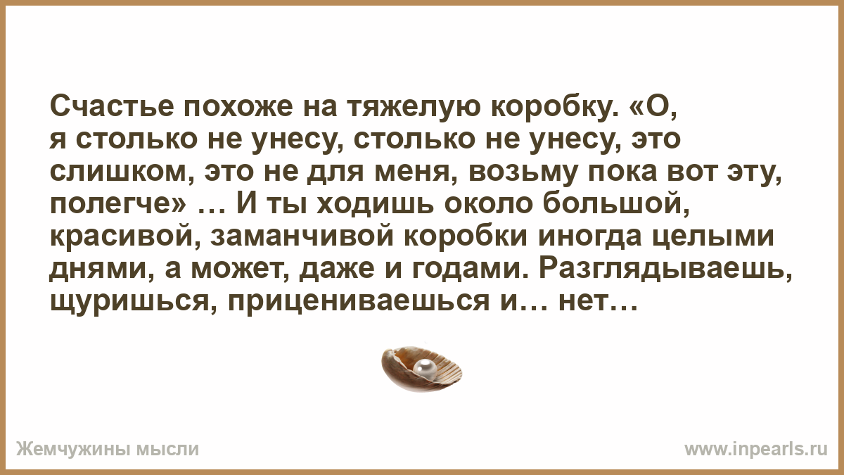 Счастье похоже на тяжелую коробку. «О, я столько не унесу, столько не унесу, это слишком, это не для меня, возьму пока вот эту, полегче» … И ты ходишь около большой, красивой, заманчивой коробки иногда целыми днями, а может, даже и годами. Разглядываешь, щуришься, прицениваешься и… нет. «Я СТОЛЬКО не унесу, не по силам, не для меня, это, наверняка, для кого-то другого приготовили». А потом наступает момент, и ты вдруг решаешься и… поднимаешь эту коробку. А она оказывается легкой! Ух ты! Это же так просто! А знаешь почему? Потому что в ней — невыносимая легкость бытия…