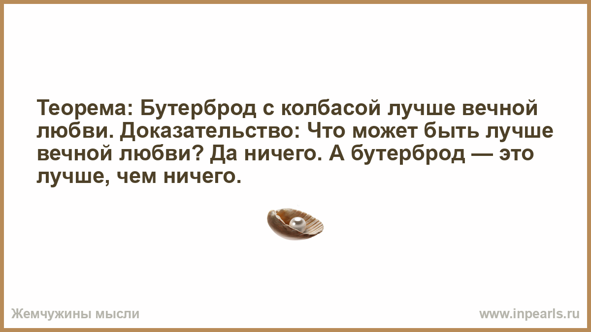 Теорема: Бутерброд с колбасой лучше вечной любви. Доказательство: Что может быть лучше вечной любви? Да ничего. А бутерброд — это лучше, чем ничего.