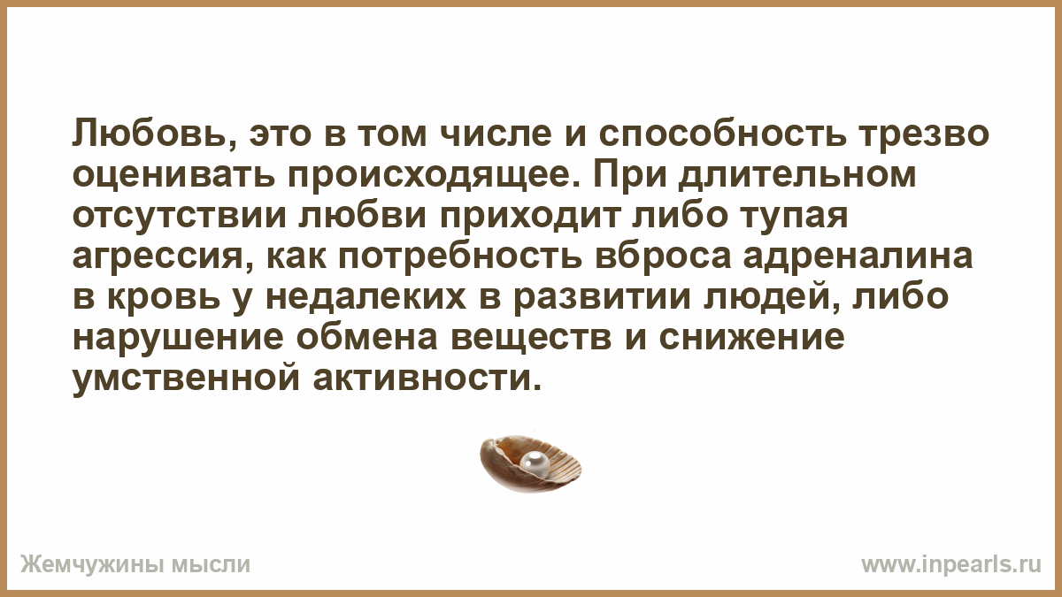 Любовь, это в том числе и способность трезво оценивать происходящее. При длительном отсутствии любви приходит либо тупая агрессия, как потребность вброса адреналина в кровь у недалеких в развитии людей, либо нарушение обмена веществ и снижение умственной активности.