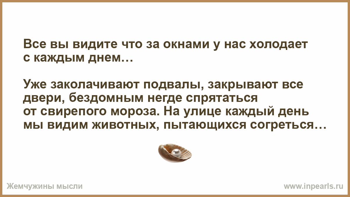 Уже заколачивают подвалы, закрывают все двери, бездомным негде спрятаться от свирепого мороза. На улице каждый день мы видим животных, пытающихся согреться… Но не только холод испытывает беззащитных. Голод, транспорт, злые люди… Очень трудно жить, когда ты никому не нужен, когда нет надежды даже на теплое местечко и кусок хлеба… Ребята, пожалуйста, по возможности берите животных на передержки. Чаще подкармливайте птиц и животных и, если не можете взять на передержку, то хотя бы пустите погреться в подъезд!