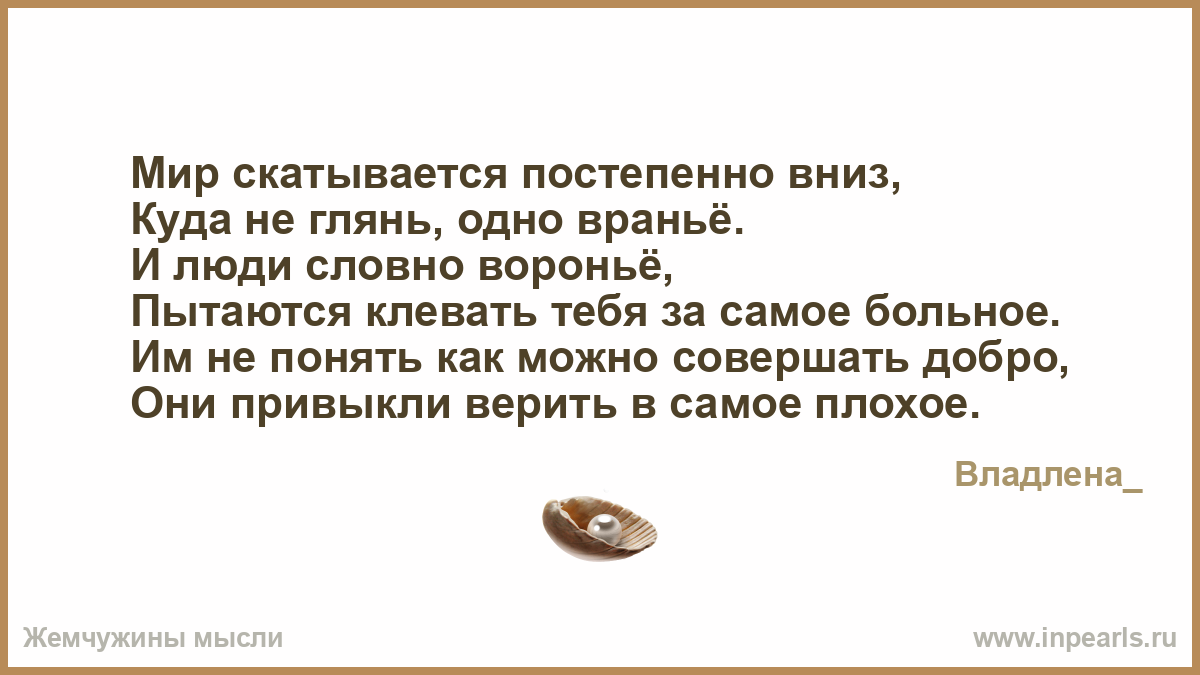 Мир скатывается постепенно вниз, Куда не глянь, одно враньё. И люди словно вороньё, Пытаются клевать тебя за самое больное. Им не понять как можно совершать добро, Они привыкли верить в самое плохое.