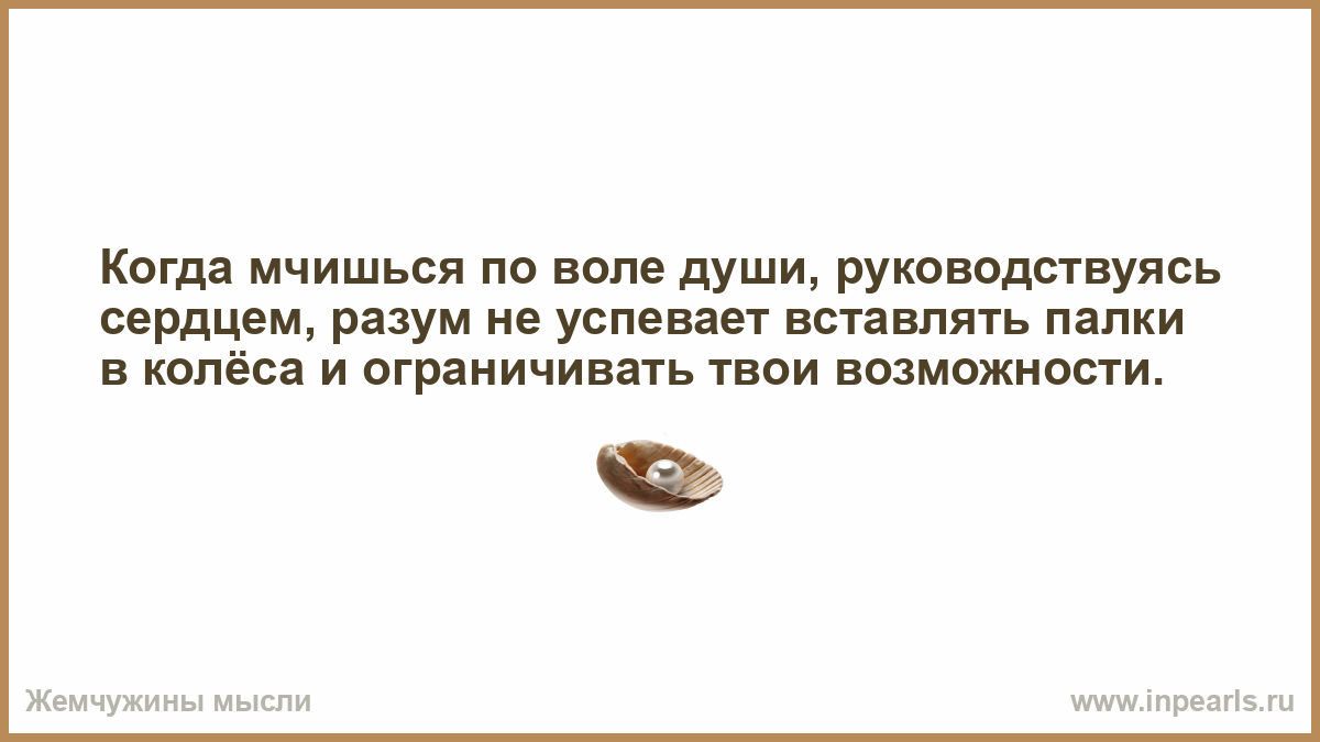 Когда мчишься по воле души, руководствуясь сердцем, разум не успевает вставлять палки в колёса и ограничивать твои возможности.