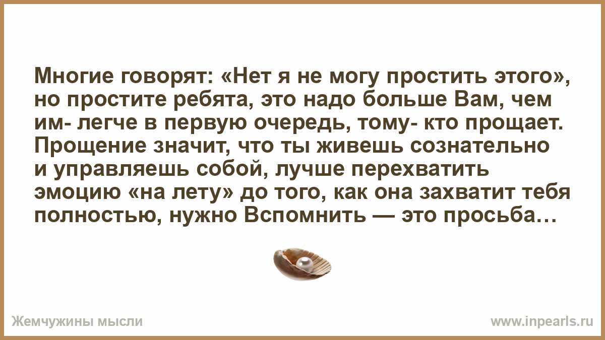 Многие говорят: «Нет я не могу простить этого», но простите ребята, это надо больше Вам, чем им- легче в первую очередь, тому- кто прощает. Прощение значит, что ты живешь сознательно и управляешь собой, лучше перехватить эмоцию «на лету» до того, как она захватит тебя полностью, нужно Вспомнить — это просьба о помощи.