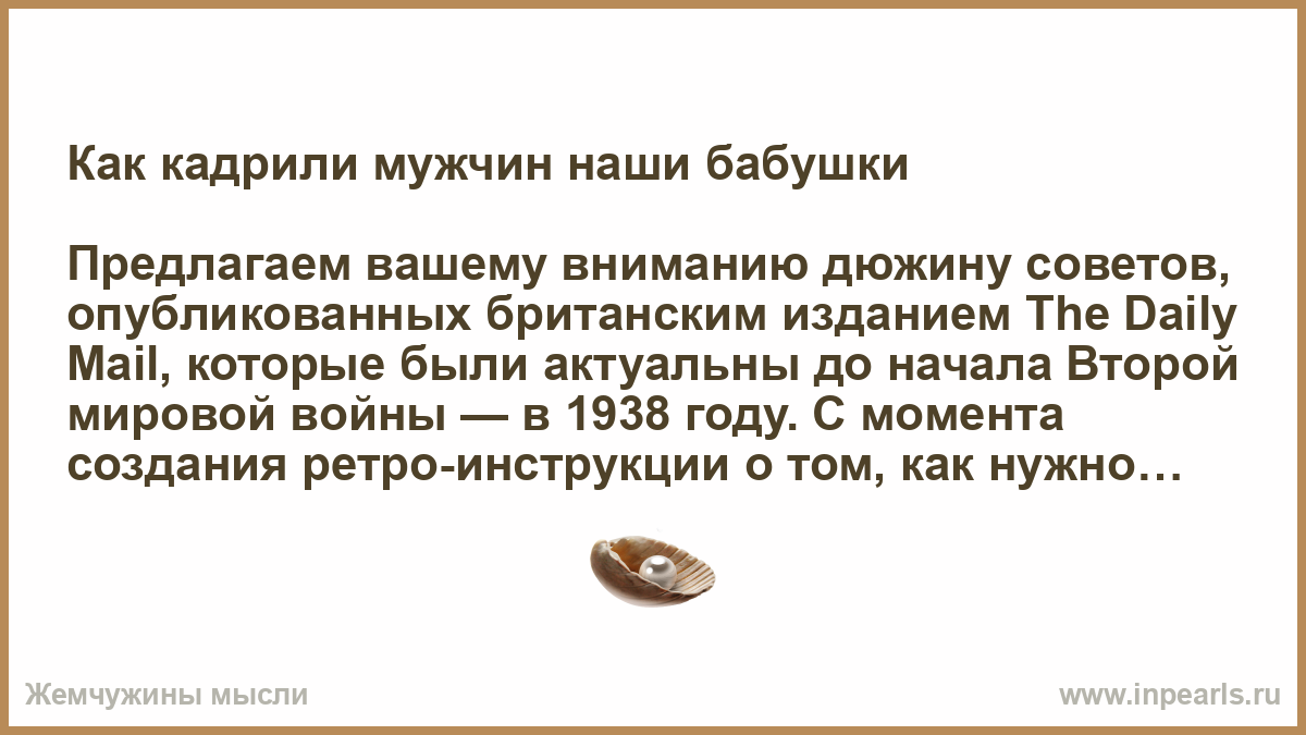 Предлагаем вашему вниманию дюжину советов, опубликованных британским изданием The Daily Mail, которые были актуальны до начала Второй мировой войны — в 1938 году. С момента создания ретро-инструкции о том, как нужно вести себя в присутствии мужчины, который вам нравится, прошло чуть меньше ста лет. Устарели ли эти правила сегодня? Судите сами!