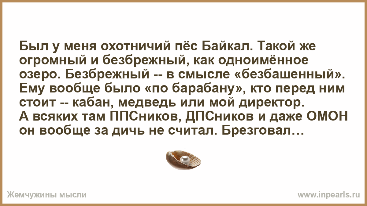 Был у меня охотничий пёс Байкал. Такой же огромный и безбрежный, как одноимённое озеро. Безбрежный -- в смысле «безбашенный». Ему вообще было «по барабану», кто перед ним стоит -- кабан, медведь или мой директор. А всяких там ППСников, ДПСников и даже ОМОН он вообще за дичь не считал. Брезговал… В общем, кидался на любого зверя. Даже на меня один раз по пьяни… Не, я-то уже давно не пью! Всё он виноват, Байкал. А было это лет семь назад, зимой, после Нового года. Шли мы с Байкалом по следу… Долго шли… Устал я сильно, поэтому и решил сесть на пенёк, съесть пирожок, запить каким-нибудь допингом… Ну, как -- каким-нибудь, если термос мне ещё в электричке раздавили, и кроме водки пить было совсем нечего… Присел я, значит, на пенёк, выпил чуть-чуть… Потом вторую пол-литру достал… И тут Байкал психанул чё-то… Зло так глянул на меня и говорит: «Мы на охоту приехали или водку бухать?» Пока я соображал (примерещилось или «белка»?), чувствую -- петля на шее затягивается ! Этот вражина что удумал? Один конец поводка связал «на удавку», второй прицепил к своему ошейнику и лёгкой трусцой двинул в сторону дома ! Очнулся я уже в квартире на кровати. Лежу и думаю :" Ну, ладно, 18 км до города на лыжах я мог пробежать… Но там же до дому целый час езды на автобусе с пересадкой ! Как же он меня на лыжах в автобус затащил? И чем за проезд платил? У меня-то точно денег не было ! Зачем в лесу деньги, если есть ружьё !!! А может он меня… того… через весь город ?.. Ё-моё ! Я же -- зам. директора градообразующего предприятия ! Меня же пол-города в лицо знает !!! Неудобно-то как получилось !!! «Вот так я и бросил пить. На корпоративе могу с одним бокалом сухого красного весь вечер просидеть ! Меня за глаза уже «Французом» прозвали. Наверное, потому, что они тоже странные -- за обедом могут выпит бокал вина, и всё… Один бокал -- и всё ! Представляете? Я раньше тоже не представлял. Спасибо Байкалу -- теперь представляю…