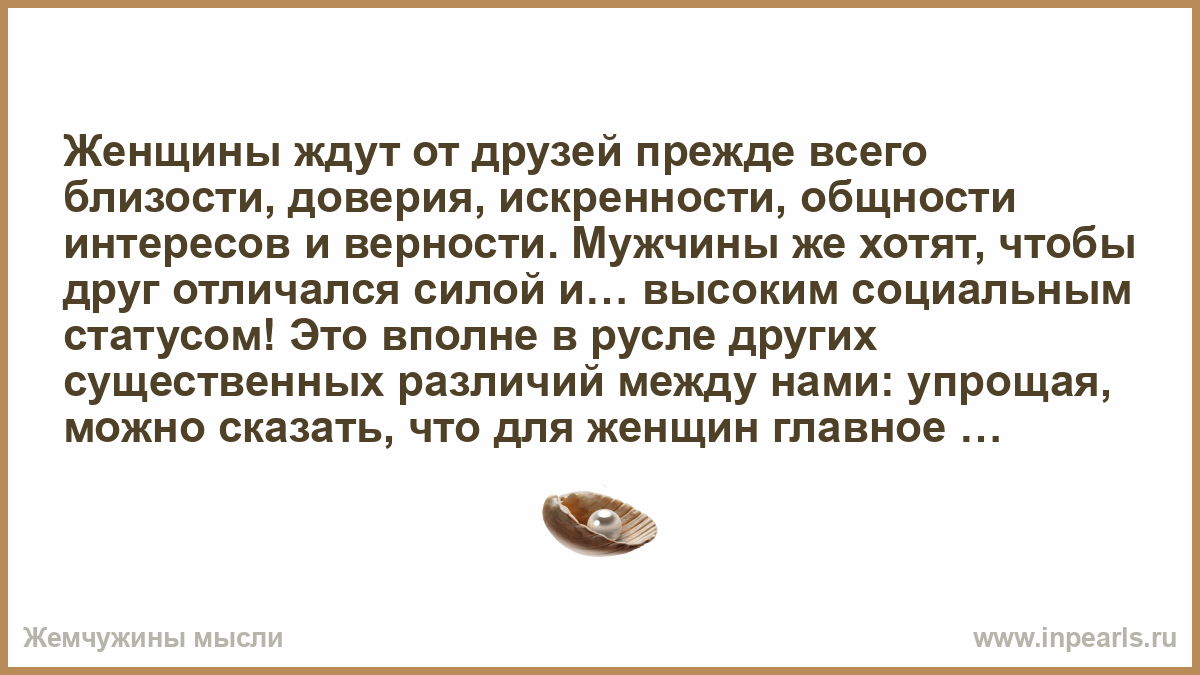 Женщины ждут от друзей прежде всего близости, доверия, искренности, общности интересов и верности. Мужчины же хотят, чтобы друг отличался силой и… высоким социальным статусом! Это вполне в русле других существенных различий между нами: упрощая, можно сказать, что для женщин главное — взаимопомощь и общение, для мужчин — соперничество. И в этом последнем случае сильный союзник действительно полезнее, чем чуткий собеседник…