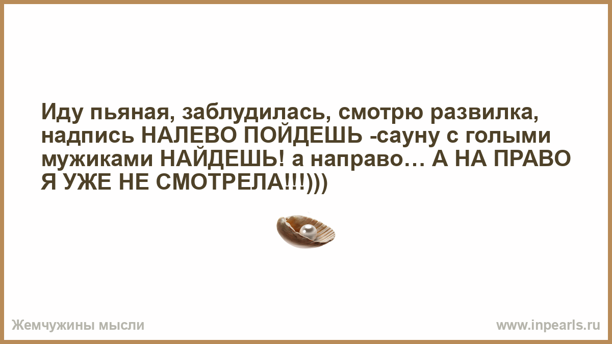Иду пьяная, заблудилась, смотрю развилка, надпись НАЛЕВО ПОЙДЕШЬ -сауну с голыми мужиками НАЙДЕШЬ! а направо… А НА ПРАВО Я УЖЕ НЕ СМОТРЕЛА!!!)))