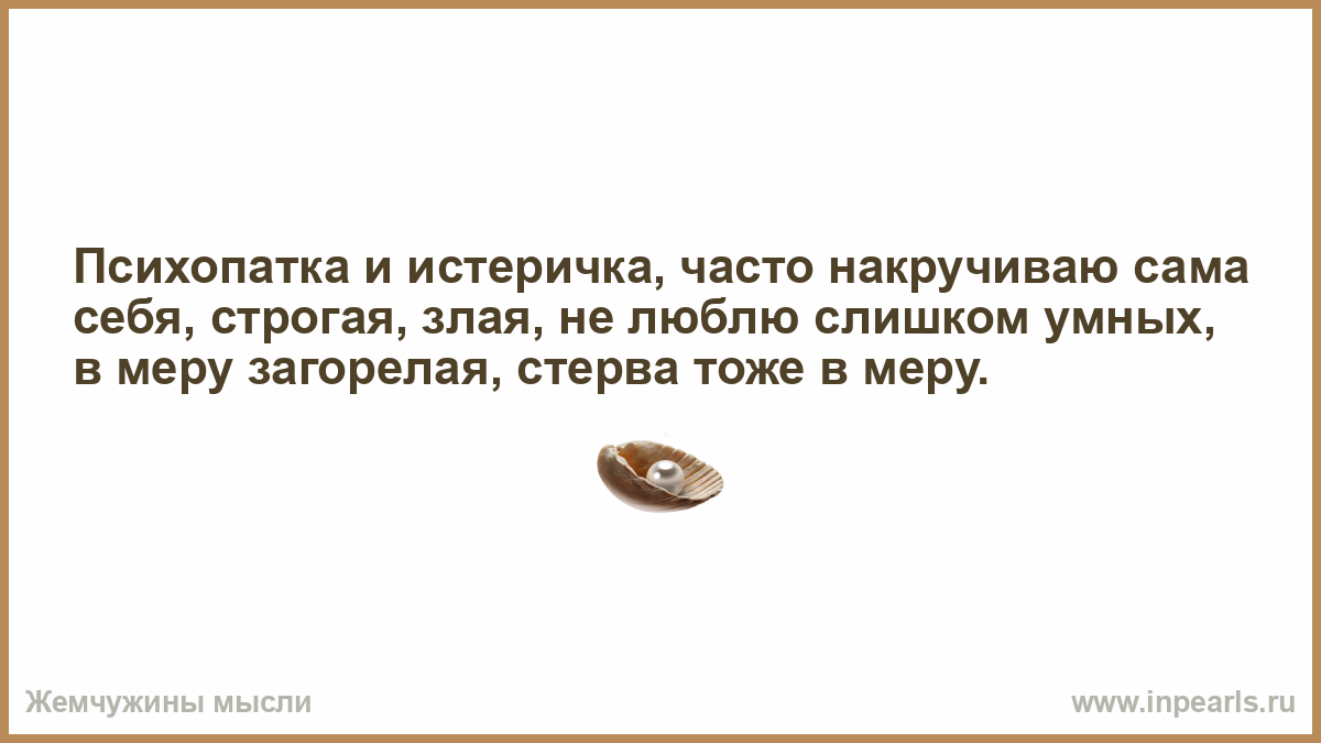 Психопатка и истеричка, часто накручиваю сама себя, строгая, злая, не люблю слишком умных, в меру загорелая, стерва тоже в меру.