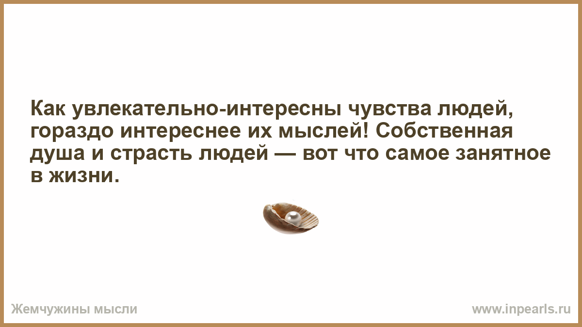 Как увлекательно-интересны чувства людей, гораздо интереснее их мыслей! Собственная душа и страсть людей — вот что самое занятное в жизни.