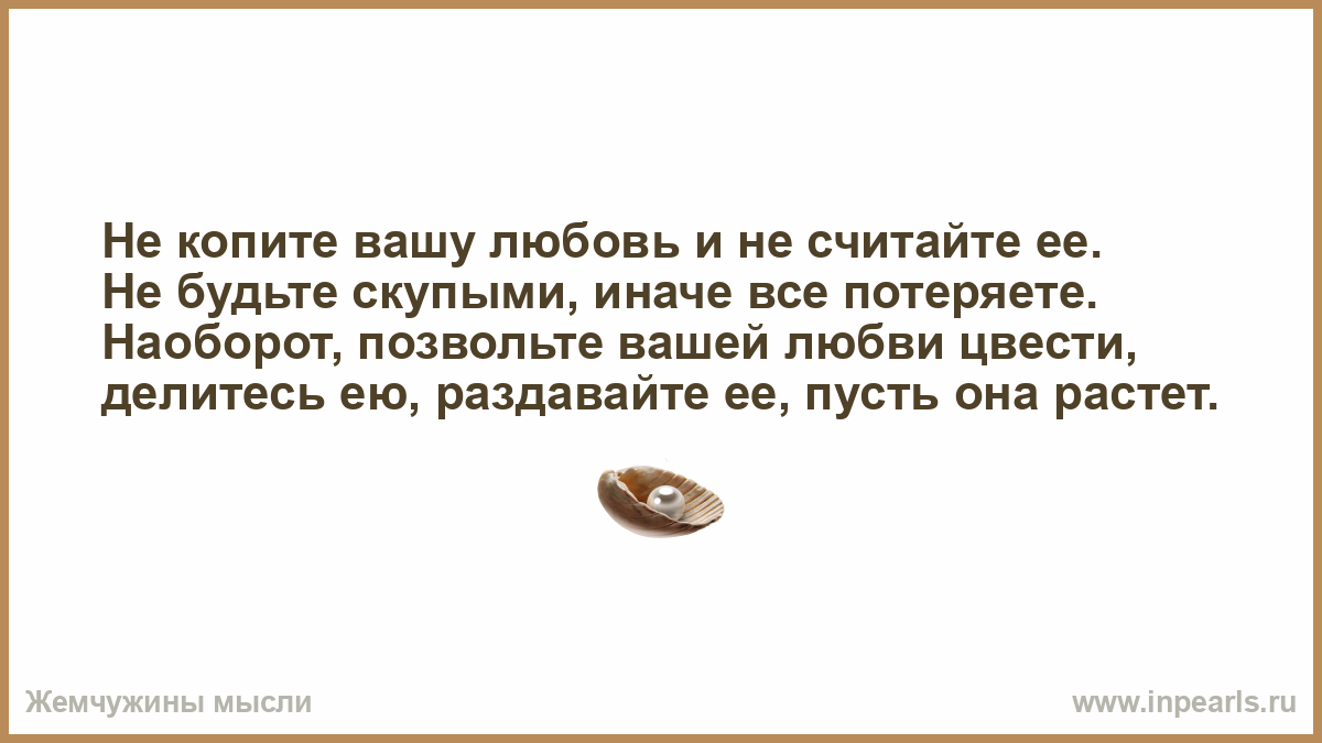 Не копите вашу любовь и не считайте ее. Не будьте скупыми, иначе все потеряете. Наоборот, позвольте вашей любви цвести, делитесь ею, раздавайте ее, пусть она растет.