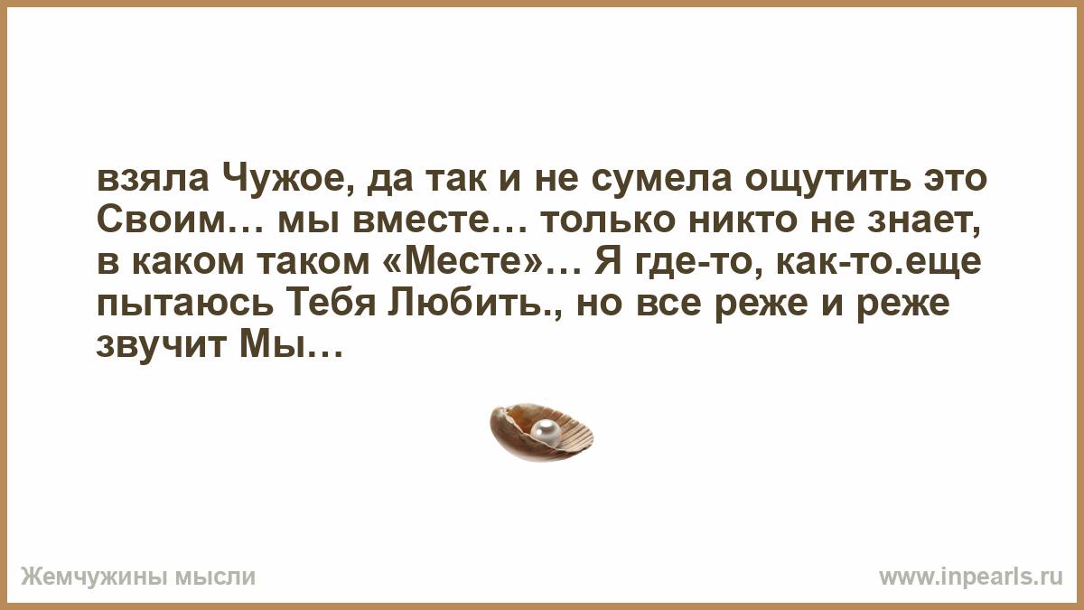 взяла Чужое, да так и не сумела ощутить это Своим… мы вместе… только никто не знает, в каком таком «Месте»… Я где-то, как-то.еще пытаюсь Тебя Любить., но все реже и реже звучит Мы…