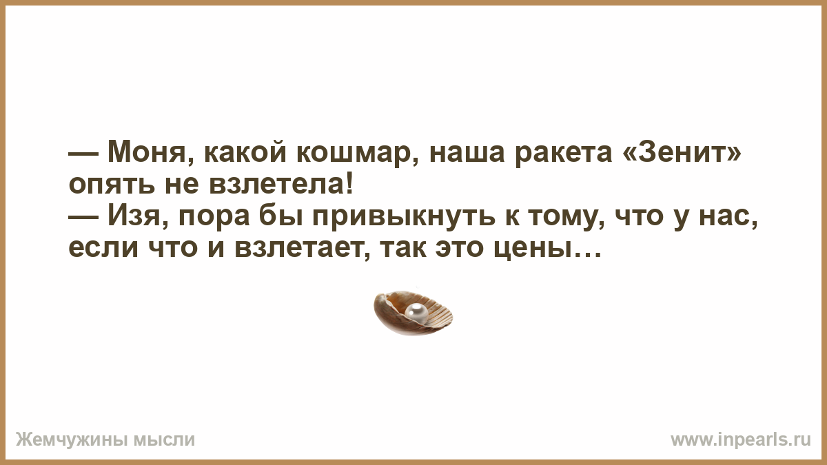— Моня, какой кошмар, наша ракета «Зенит» опять не взлетела!