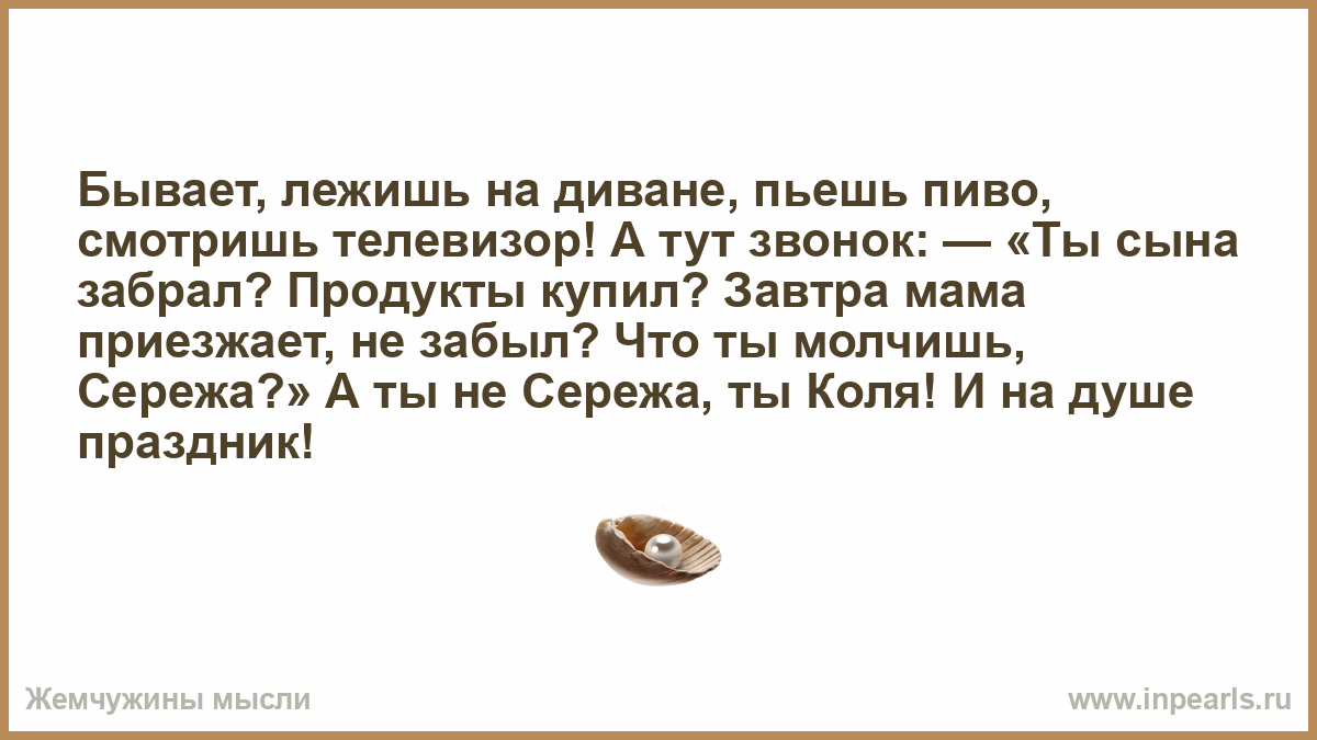Бывает, лежишь на диване, пьешь пиво, смотришь телевизор! А тут звонок: — «Ты сына забрал? Продукты купил? Завтра мама приезжает, не забыл? Что ты молчишь, Сережа?» А ты не Сережа, ты Коля! И на душе праздник!