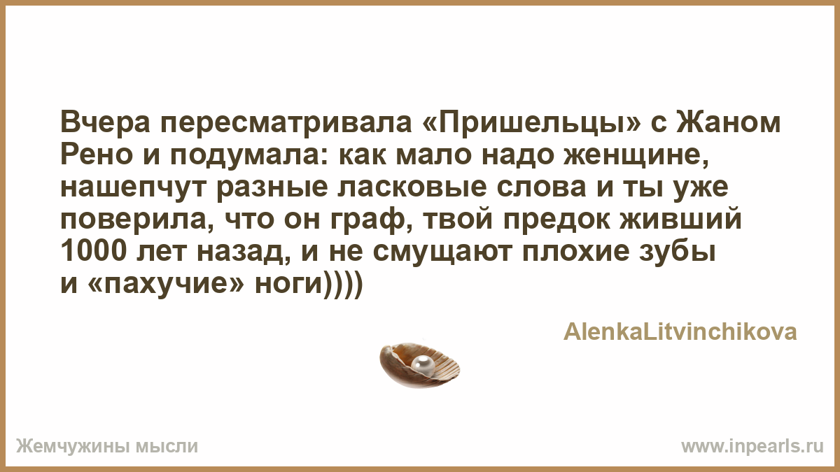Вчера пересматривала «Пришельцы» с Жаном Рено и подумала: как мало надо женщине, нашепчут разные ласковые слова и ты уже поверила, что он граф, твой предок живший 1000 лет назад, и не смущают плохие зубы и «пахучие» ноги))))