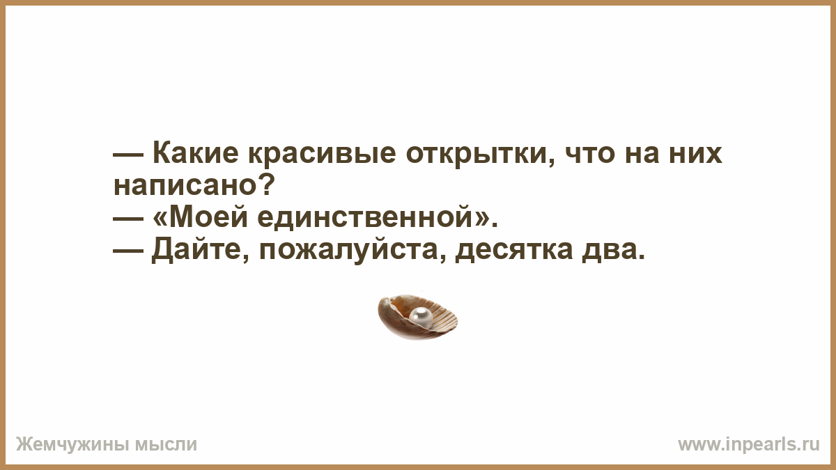 — Какие красивые открытки, что на них написано? — «Моей единственной». — Дайте, пожалуйста, десятка два.
