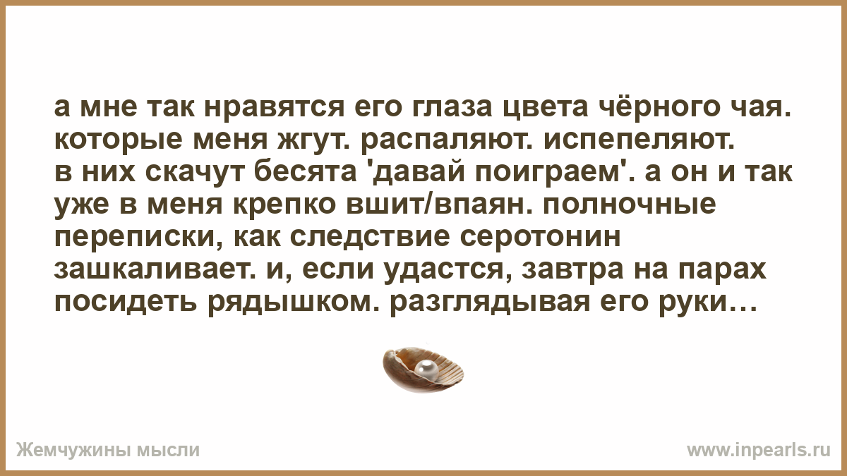 а мне так нравятся его глаза цвета чёрного чая. которые меня жгут. распаляют. испепеляют. в них скачут бесята 'давай поиграем'. а он и так уже в меня крепко вшит/впаян. полночные переписки, как следствие серотонин зашкаливает. и, если удастся, завтра на парах посидеть рядышком. разглядывая его руки мужские/сильные. мечтать поносить его браслет-ремешок. а от него так пахнет мужчиной. мысли в замысловатый пучок. потом сиди, распутывай. в электричке. через все 52 километра. пока снятся его глаза цвета чёрного чая.
