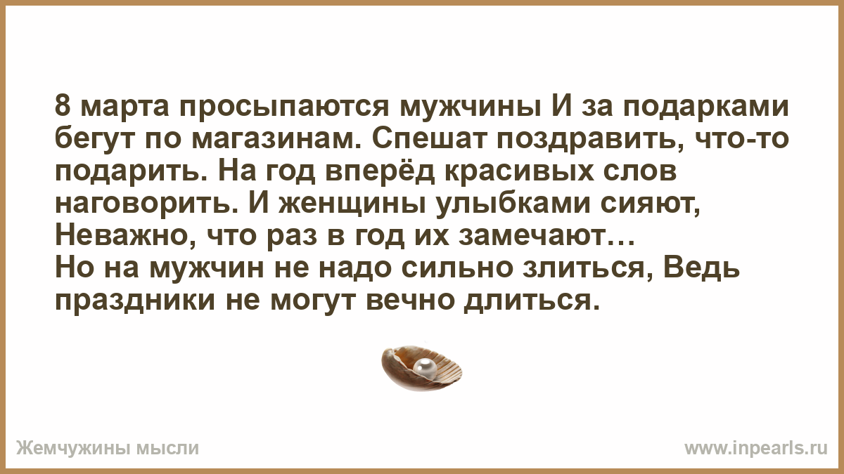 8 марта просыпаются мужчины И за подарками бегут по магазинам. Спешат поздравить, что-то подарить. На год вперёд красивых слов наговорить. И женщины улыбками сияют, Неважно, что раз в год их замечают… Но на мужчин не надо сильно злиться, Ведь праздники не могут вечно длиться.