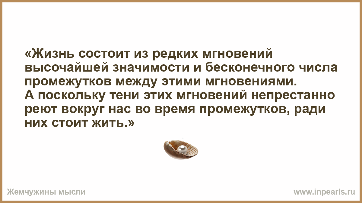 «Жизнь состоит из редких мгновений высочайшей значимости и бесконечного числа промежутков между этими мгновениями. А поскольку тени этих мгновений непрестанно реют вокруг нас во время промежутков, ради них стоит жить.»