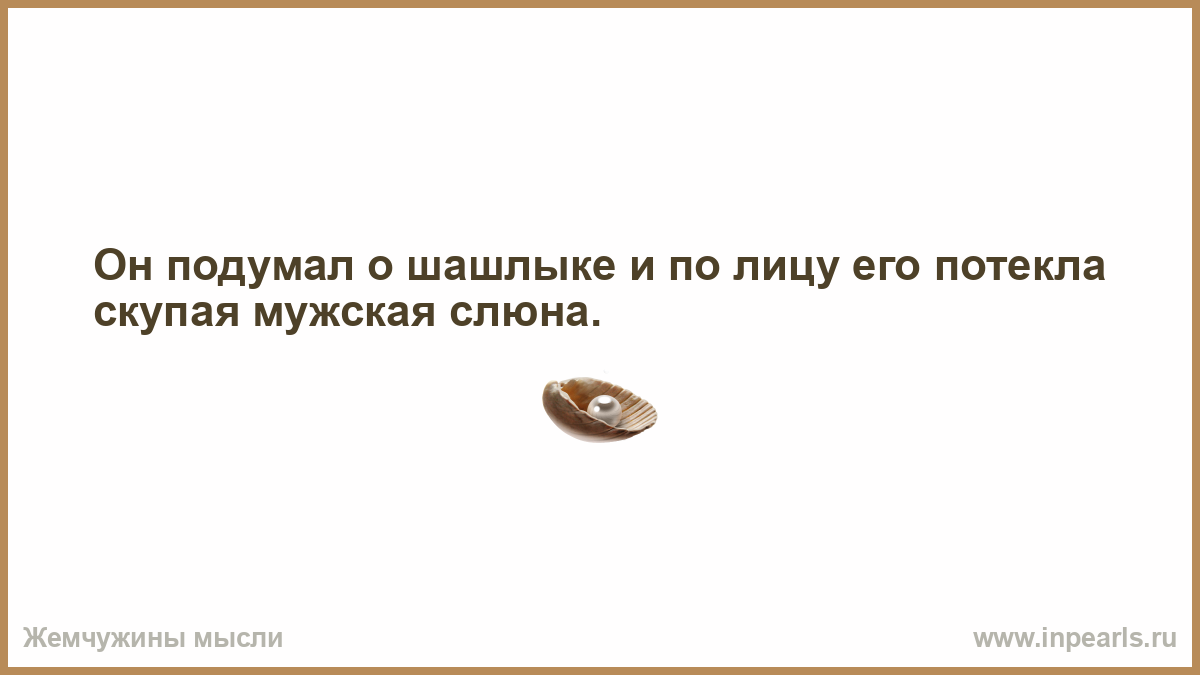 Он подумал о шашлыке и по лицу его потекла скупая мужская слюна.