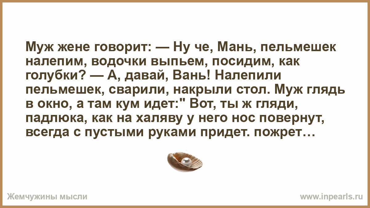 Муж жене говорит: — Ну че, Мань, пельмешек налепим, водочки выпьем, посидим, как голубки? — А, давай, Вань! Налепили пельмешек, сварили, накрыли стол. Муж глядь в окно, а там кум идет:" Вот, ты ж гляди, падлюка, как на халяву у него нос повернут, всегда с пустыми руками придет. пожрет, попьет… Ты, знаешь Мань, Я сейчас под кровать залезу, а ты скажи ему, что я в город уехал. Заходит кум в хату: — Добрый вечер вам! О. а у вас пельмени?! А у меня водочка! А где же кум? — Да он в город уехал, а вы проходите, куме, проходите. Сядем, поужинаем. Сели, рюмочка за рюмочкой да под пельмешки! Дело до кровати дошло. Кровать аж ходуном ходит! Муж лежит под кроватью и говорит: — Ну, бля, вернусь из города убью