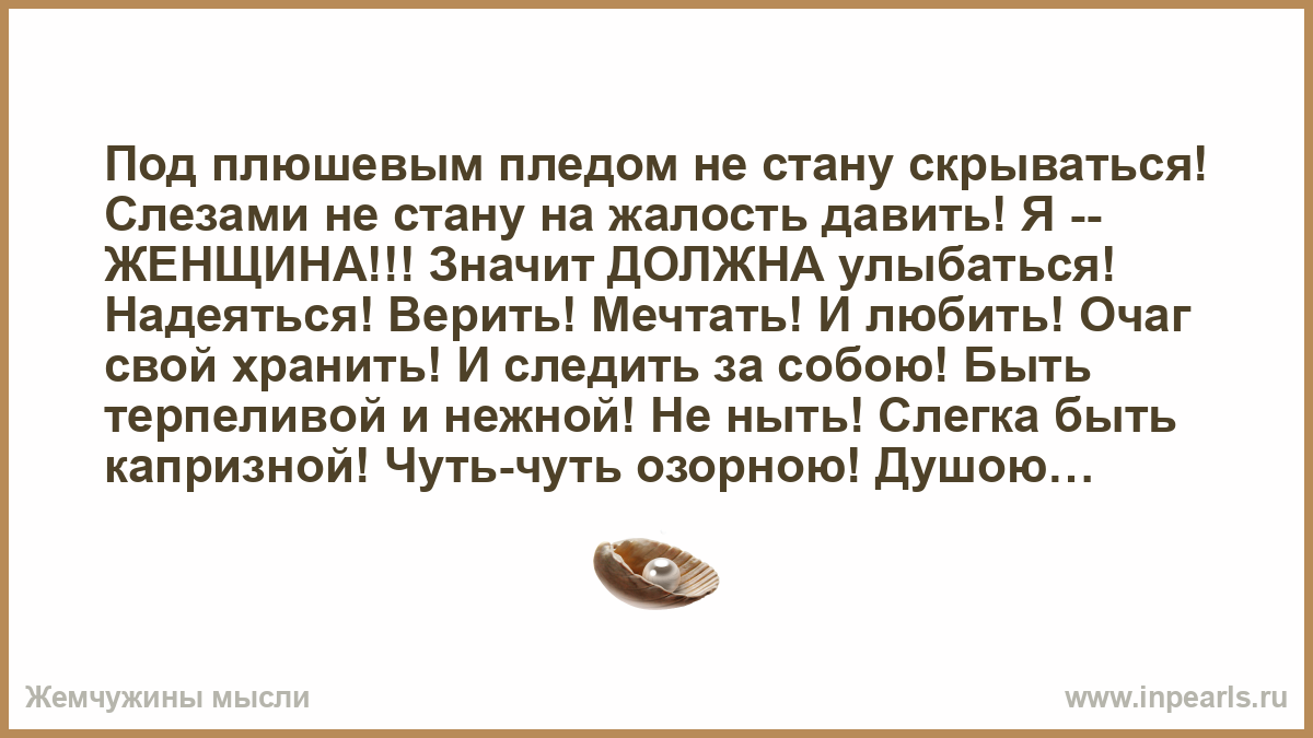 Под плюшевым пледом не стану скрываться! Слезами не стану на жалость давить! Я -- ЖЕНЩИНА!!! Значит ДОЛЖНА улыбаться! Надеяться! Верить! Мечтать! И любить! Очаг свой хранить! И следить за собою! Быть терпеливой и нежной! Не ныть! Слегка быть капризной! Чуть-чуть озорною! Душою и сердцем красивою быть!!! Дарить близким радость, уют и внимание! Долго обиды в себе не хранить!!! Пусть чуть смешною! Немного не правильной! НО НАСТОЯЩЕЙ И ИСКРЕННЕЙ БЫТЬ!!!