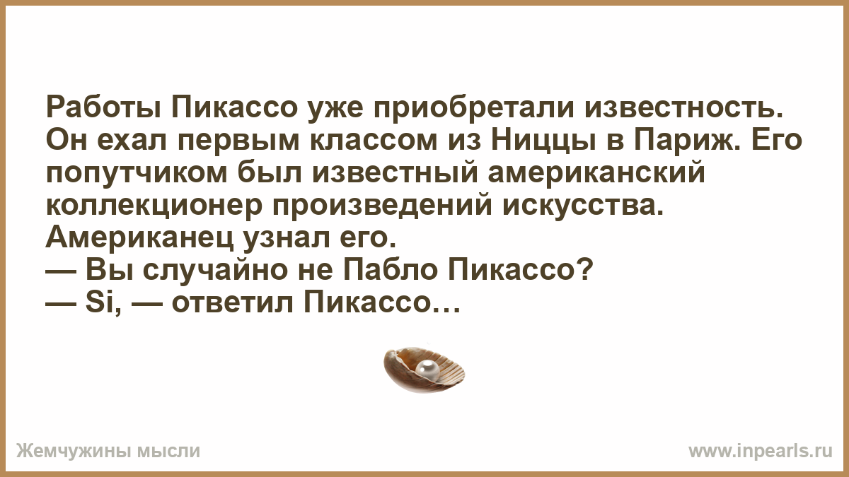 О, я понял, — сказал Пикассо с абсолютно серьезным выражением лица, — Ваша жена очень худенькая, симпатичная и примерно десять сантиметров ростом?!