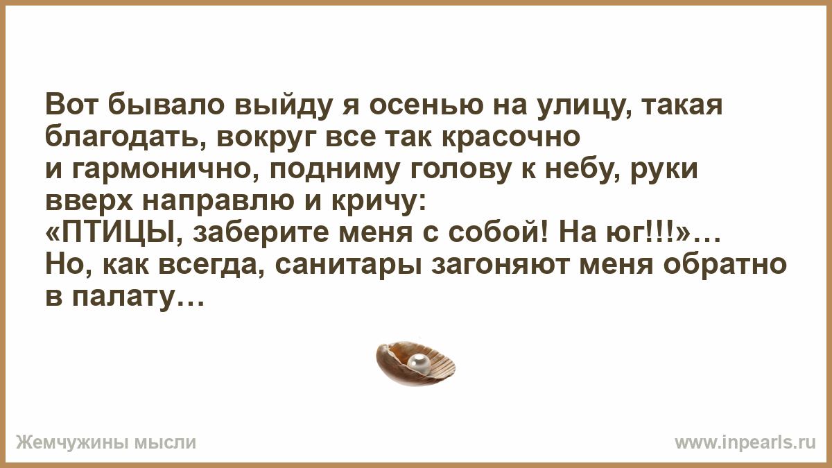 Вот бывало выйду я осенью на улицу, такая благодать, вокруг все так красочно и гармонично, подниму голову к небу, руки вверх направлю и кричу: